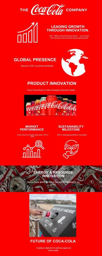 This infographic communicates Coca-Cola’s long-term business strength and commitment to responsible innovation. By highlighting measurable milestones—such as $47.1 billion in annual revenue, a 90% recyclable packaging rate, and the company’s goal for net-zero emissions by 2050—it visually connects Coca-Cola’s financial growth to its sustainability leadership. The red-and-black color palette reinforces brand recognition, while the concise text and data emphasize credibility and progress. Strategically, this messaging aligns with Coca-Cola’s legacy of “refreshment” by redefining it for a modern era—showing that true refreshment means balancing profitability, innovation, and environmental accountability.